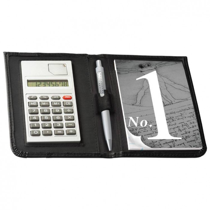 Блокнот зі шкіри PU містить: дві рукоятки для ручок (всередині та зовні блокнота), калькулятор, блокнот та перегородку. Запакований у целофановий пакетик. Група нанесення: T4/HS