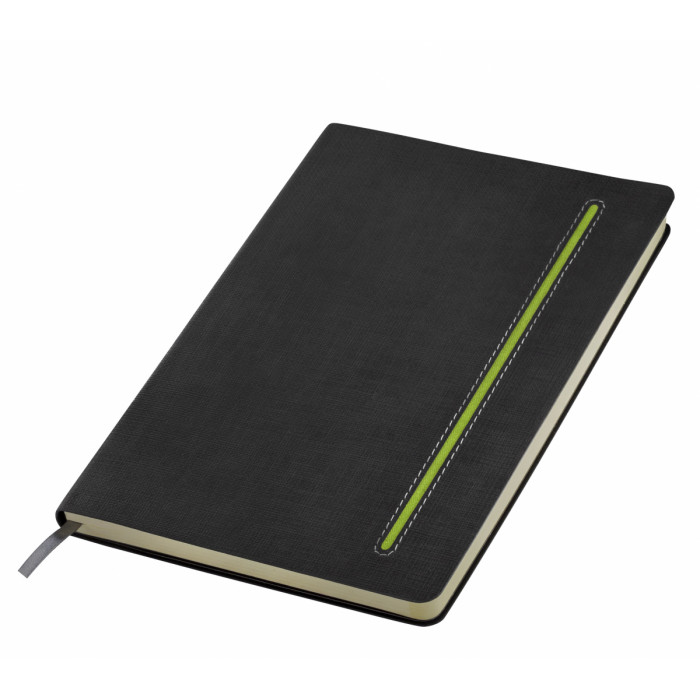 Бизнес-блокнот "Elegance", 148х210 мм, вручную прошитая лента на титульной обложке, черный форзац, мягкая обложка, внутренний блок - клетка, ляссе серого цвета - 7 мм, задний кармашек с расширением (для заметок, карточек, денег и пр.), стикер с контактной информацией, общее количество стр. - 256, в конце блока - 16 перфорированных стр. Тип/Цвет внутреннего блока - 70 г, FSC-бумага/слоновая кость.