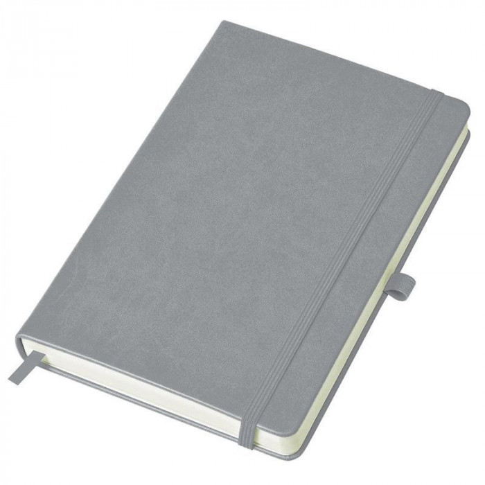 Бизнес-блокнот "Justy", 130х210 мм, серый, твердая обложка, эластичная резинка серого цвета в тон обложки - 7 мм, внутренний блок - линейка, заокругленные углы, ляссе серого цвета - 7 мм, задний кармашек с расширением (для заметок, визиток, карточек, денег и пр.), общее количество стр. - 256, в конце блока - 16 перфорированных стр.