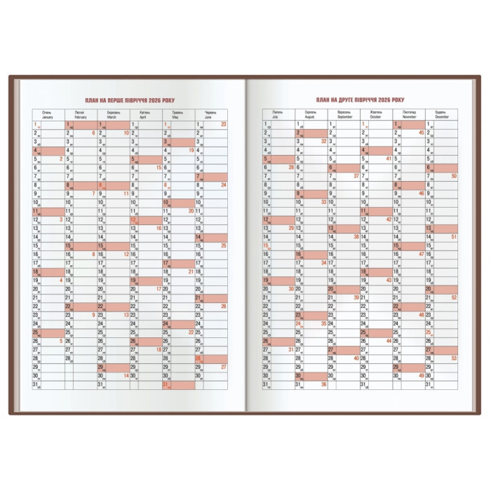Одна сторінка – один робочий день, субота та неділя на одній сторінці, інформаційний блок – 4 сторінки, блок для нотаток в клітинку - 14 сторінок.
