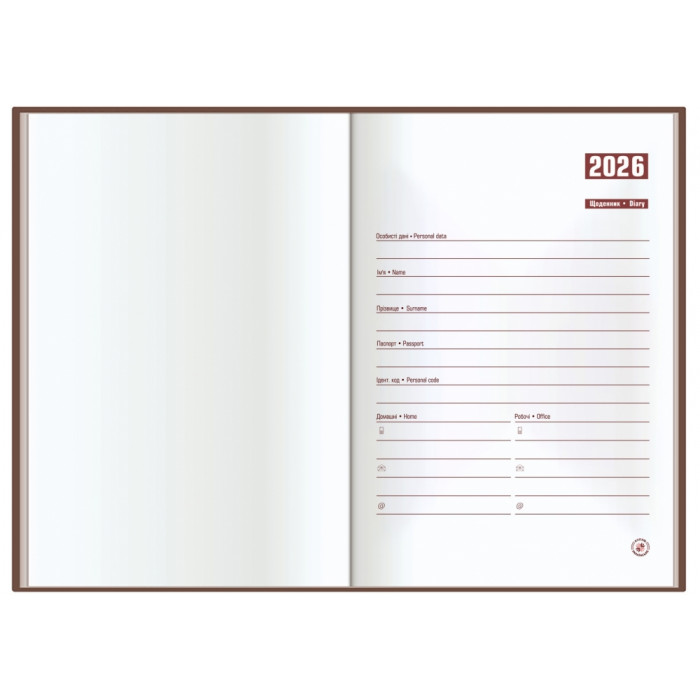 Кольори друку – бордо та темно-сірий, форзац – повно кольорові мапи України та Європи, відривний куточок, перфорація по колу, закладка – шовкова стрічка бордового кольору, на полях сторінок – регістри із зазначенням поточного місяця.
