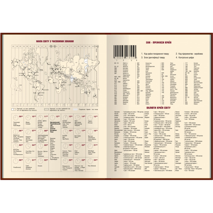Кольори друку – бордо та темно-сірий, форзац – повно кольорові мапи України та Європи, відривний куточок, перфорація по колу, закладка – шовкова стрічка бордового кольору, на полях сторінок – регістри із зазначенням поточного місяця.