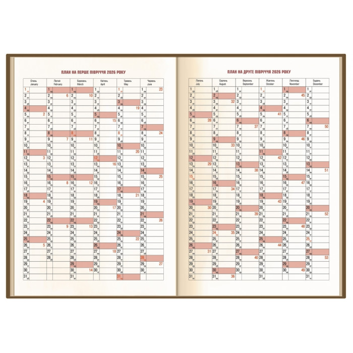 Одна сторінка – один робочий день, субота та неділя на одній сторінці, інформаційний блок – 4 сторінки, блок для нотато в клітинку - 30 сторінок.