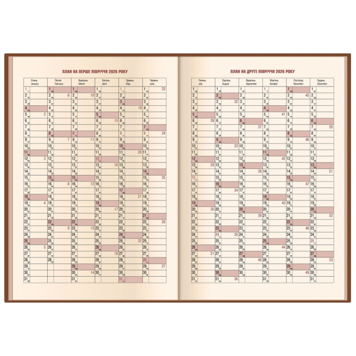 Одна сторінка – один робочий день, субота та неділя на одній сторінці, інформаційний блок – 4 сторінки, блок для нотато в клітинку - 30 сторінок.