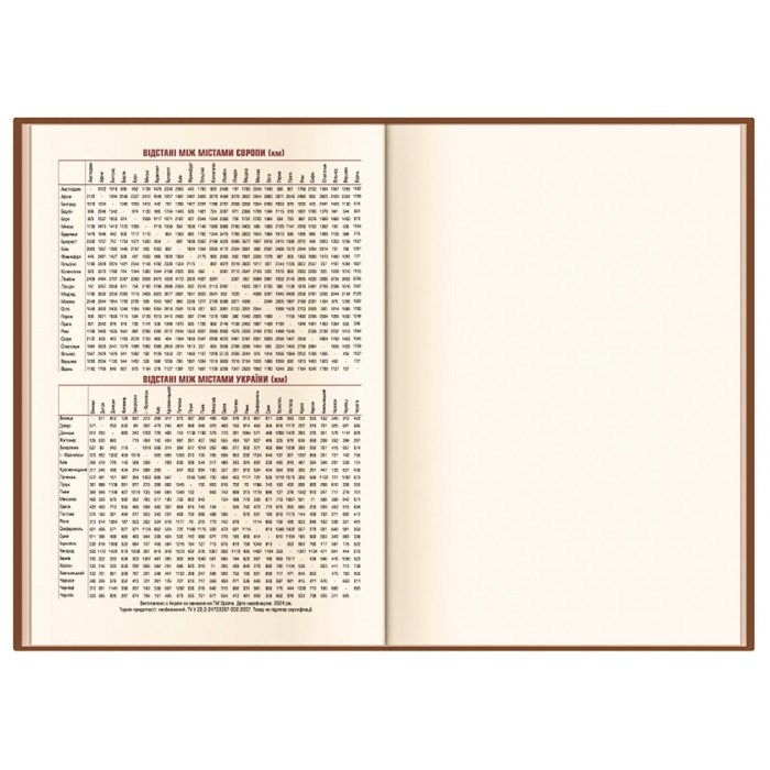 Кольори друку – бордо та темно-сірий, форзац – повно кольорові мапи України та Європи, відривний куточок, перфорація по колу, закладка – шовкова стрічка бордового кольору, на полях сторінок – регістри із зазначенням поточного місяця.