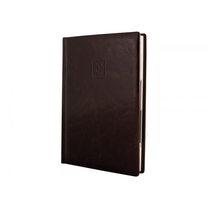 Кольори друку – бордо та темно-сірий, форзац – повно кольорові мапи України та Європи, відривний куточок, перфорація по колу, закладка – шовкова стрічка бордового кольору, на полях сторінок – регістри із зазначенням поточного місяця.