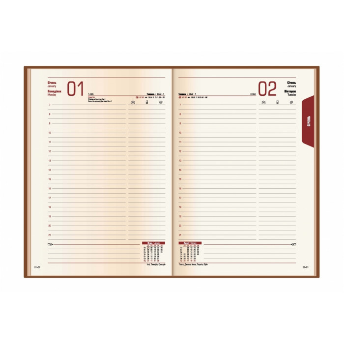 Кольори друку – бордо та темно-сірий, форзац – повно кольорові мапи України та Європи, відривний куточок, перфорація по колу, закладка – шовкова стрічка бордового кольору, на полях сторінок – регістри із зазначенням поточного місяця.