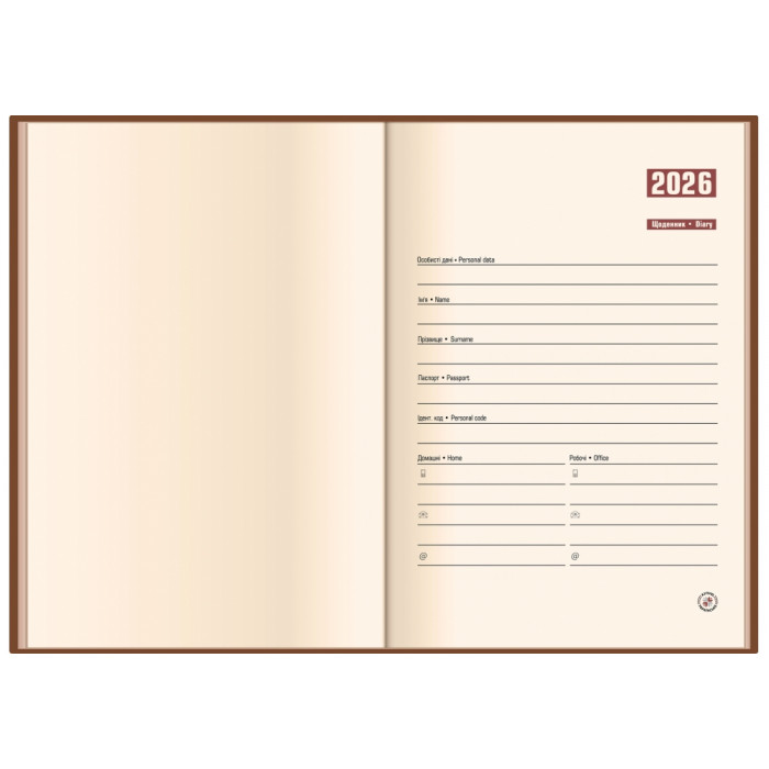 Кольори друку – бордо та темно-сірий, форзац – повно кольорові мапи України та Європи, відривний куточок, перфорація по колу, закладка – шовкова стрічка бордового кольору, на полях сторінок – регістри із зазначенням поточного місяця.