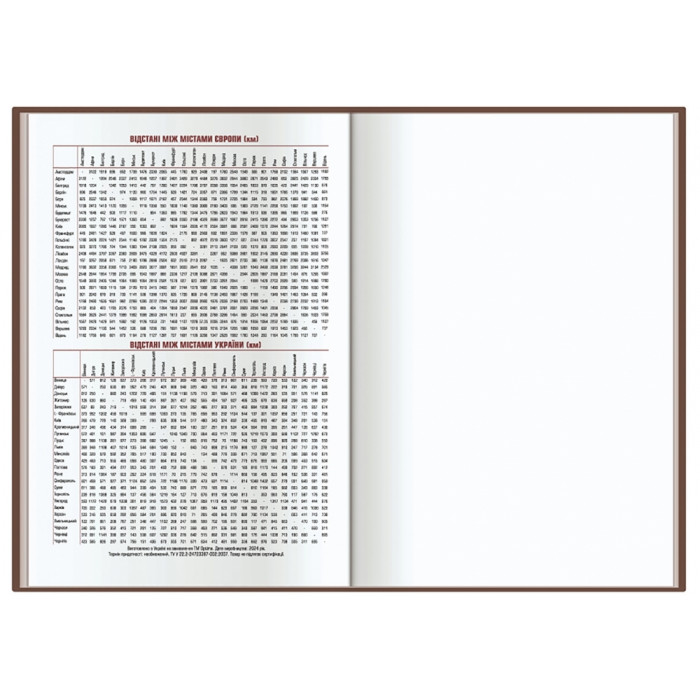 Кольори друку – бордо та темно-сірий, форзац – повно кольорові мапи України та Європи, закладка – шовкова стрічка бордового кольору, на полях сторінок – регістри із зазначенням поточного місяця.