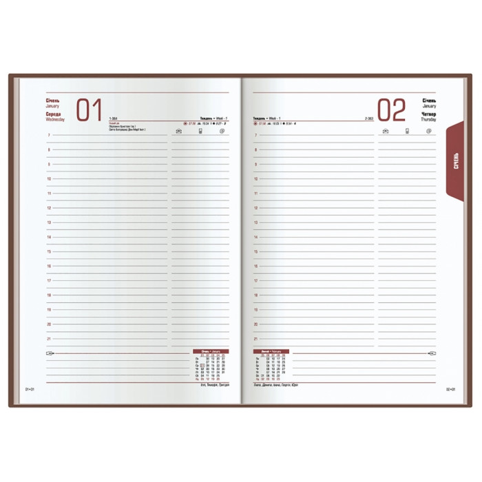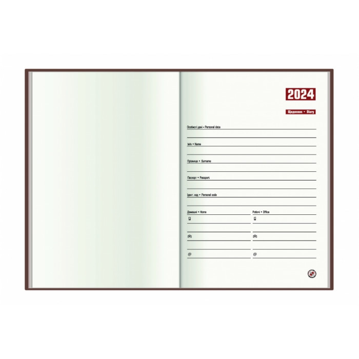 Кольори друку – бордо та темно-сірий, форзац – повно кольорові мапи України та Європи, закладка – шовкова стрічка бордового кольору, на полях сторінок – регістри із зазначенням поточного місяця.