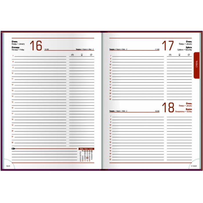 Одна сторінка – один робочий день, субота та неділя на одній сторінці, інформаційний блок – 4 сторінки, блок для нотаток в клітинку - 30 сторінок.