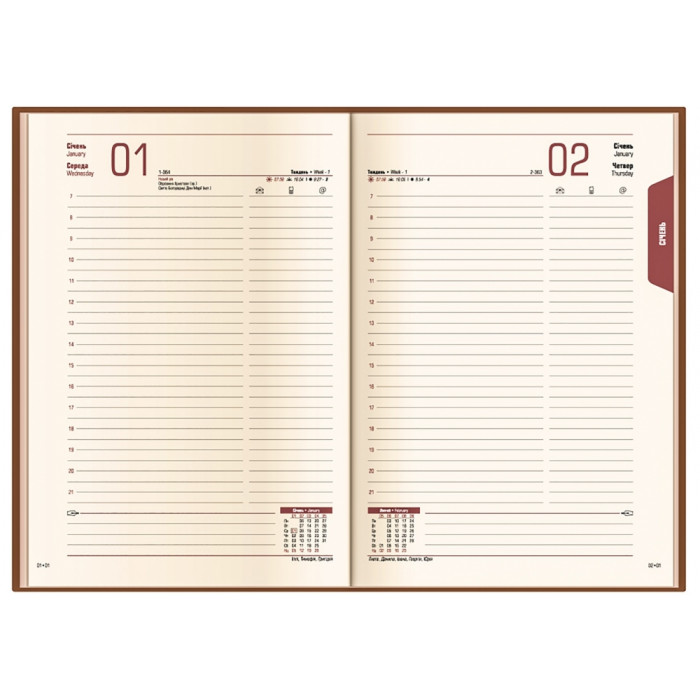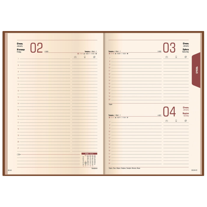 Одна сторінка – один робочий день, субота та неділя на одній сторінці, інформаційний блок – 4 сторінки, блок для нотато в клітинку - 30 сторінок.