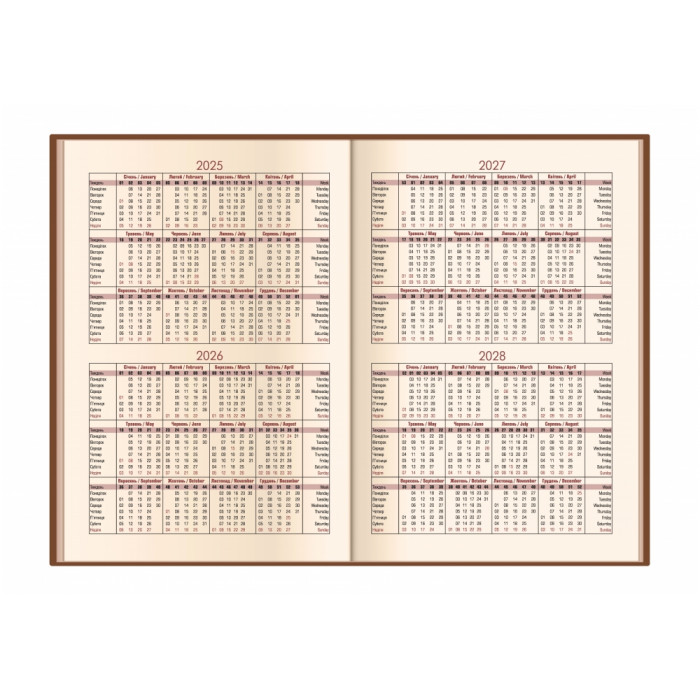 Одна сторінка – один робочий день, інформаційний блок - 9 сторінок, календарі на 4 роки, телефонна книга.