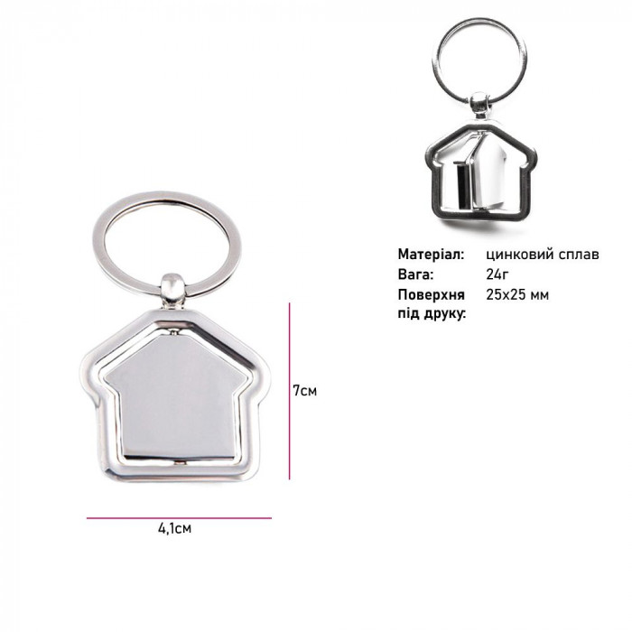 Особливістю цієї моделі є внутрішня вставка у формі будиночка, яка обертається, створюючи динамічний та привабливий ефект. Гладка поверхня підходить для брендування. Брелок може стати оригінальним корпоративним сувеніром, подарунком клієнтам і партнерам або ефективним рекламним носієм на виставках і промо-заходах.