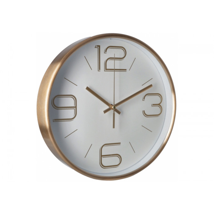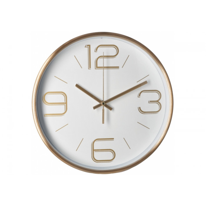 Годинник настінний; металеве обрамлення; колір корпусу: золотий; колір циферблату: білий; хід стандартний; форма кругла; діаметр - 25,2 см; тип механізму: кварцовий; елемент живлення: батарея типу АА х 1 шт (батарейка до комплекту не включена); завдяки зручному механізму швидко розбираються/збираються.