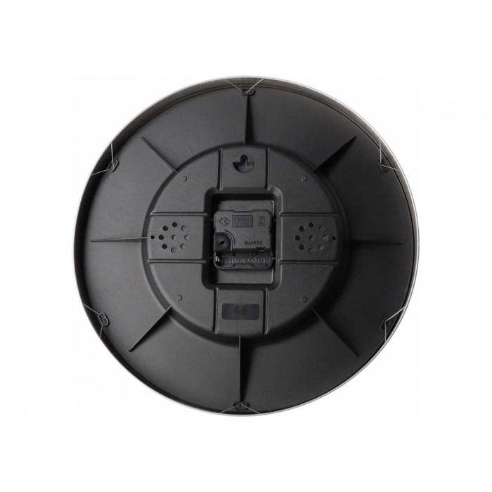 Годинник настінний; металеве обрамлення; колір корпусу: металік; колір циферблату: чорний; хід стандартний; форма кругла; діаметр - 30 см; тип механізму: кварцовий; елемент живлення: батарея типу АА х 1 шт (батарейка до комплекту не включена); завдяки зручному механізму швидко розбираються/збираються.