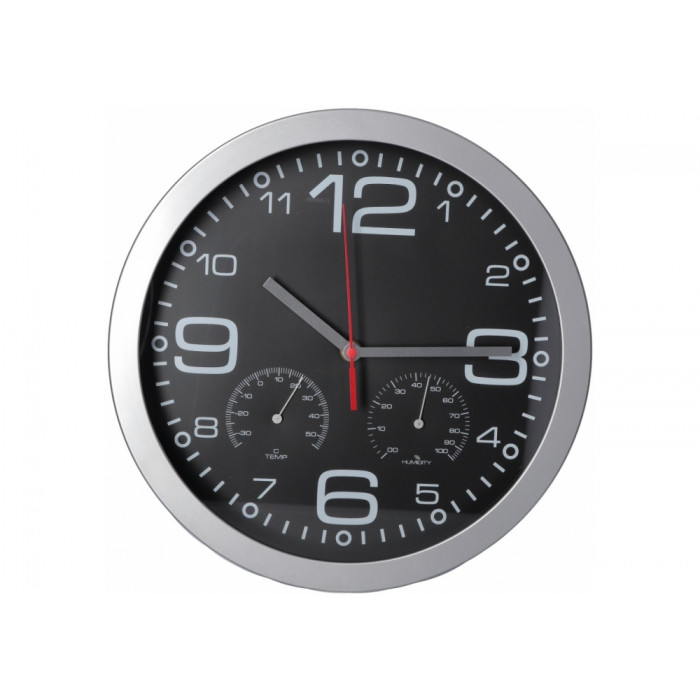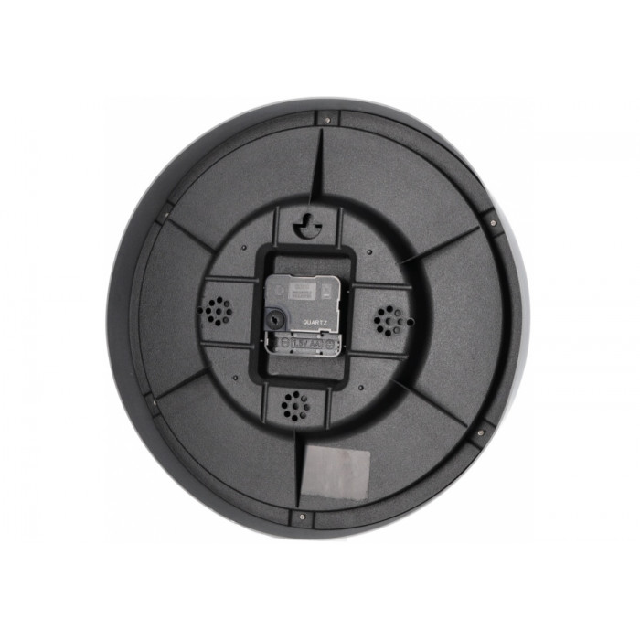Годинник настінний; металеве обрамлення; колір корпусу: металік; колір циферблату: чорний; хід стандартний; форма кругла; діаметр - 30 см; тип механізму: кварцовий; елемент живлення: батарея типу АА х 1 шт (батарейка до комплекту не включена); завдяки зручному механізму швидко розбираються/збираються.