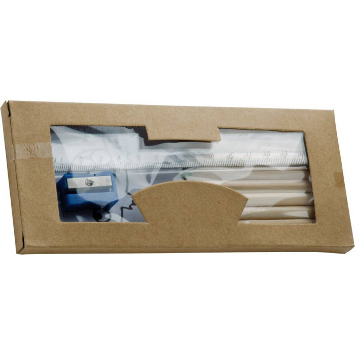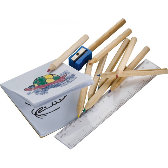 В состав входит 10 цветных карандашей, пластиковая линейка и точилка, а также несколько рисунков для раскрашивания. Вашу рекламу можно нанести на коробке. Группа нанесения: T3.