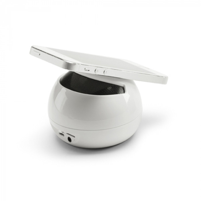Беспроводная колонка с микрофоном. ABS. С передачей bluetooth, 3,5 мм стерео кабелем и картридером TF. С 3W/4Ω. 3 часа автономной работы. Функция ответа на вызовы, регулятор громкости и подключение к плейлисту мобильного телефона. С нескользящей опорой для мобильного. Включает USB-кабель для зарядки. Поставляется в коробке. ø85 x 66 мм | Коробка: 93 x 93 x 85 мм
