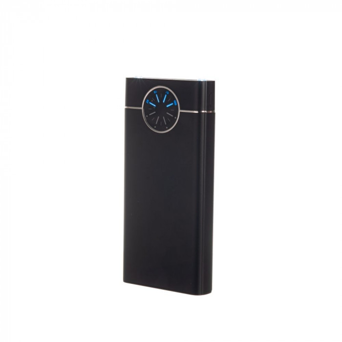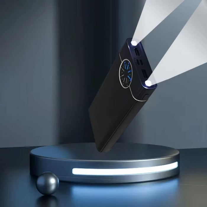 Ємність повербанка – 20000 mAh. Наявність заряду та його кількість показує вбудований світлодіодний дисплей круглої форми. Корпус пристрою декорований контрастною металевою смужкою, яка проходить на рівні дисплею.