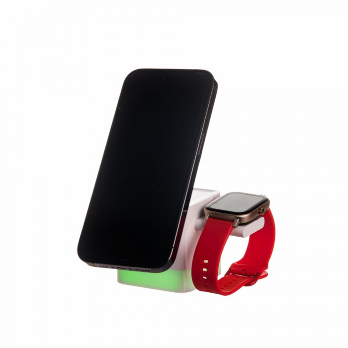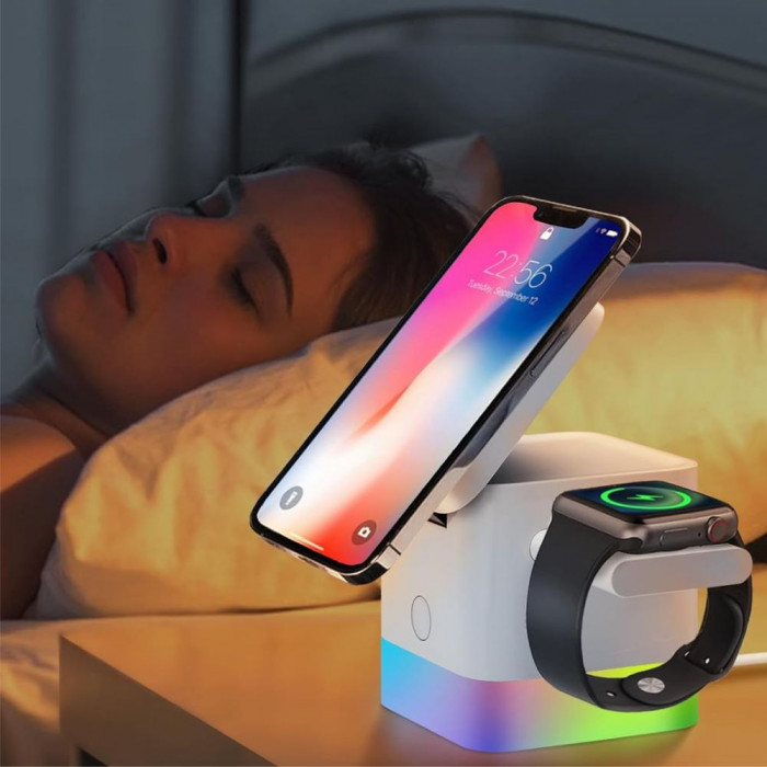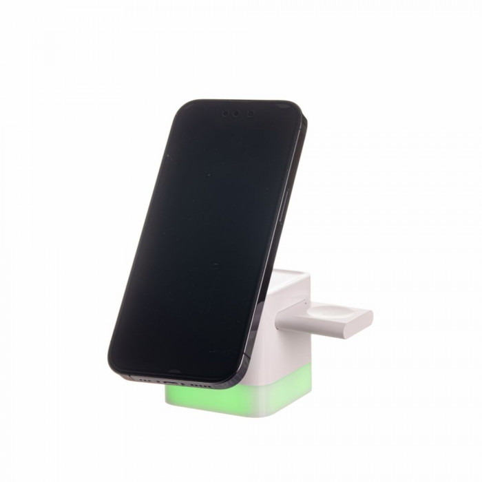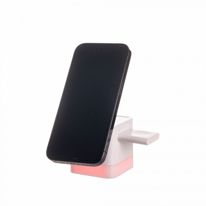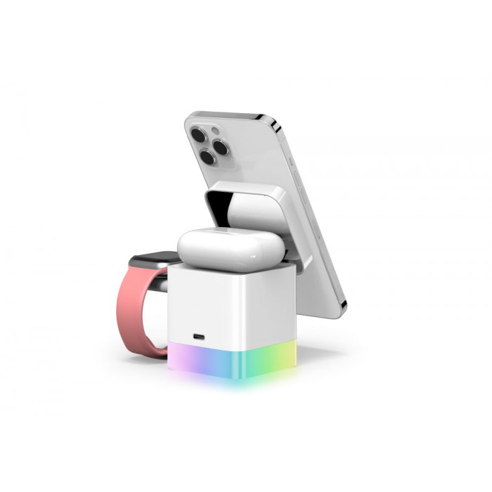 Бездротовий зарядний пристрій QuikLink з нічником rgb – це компактна модель 3 в 1 кубічної форми. Виріб виконує функції тримача, нічного світильника й зарядника.