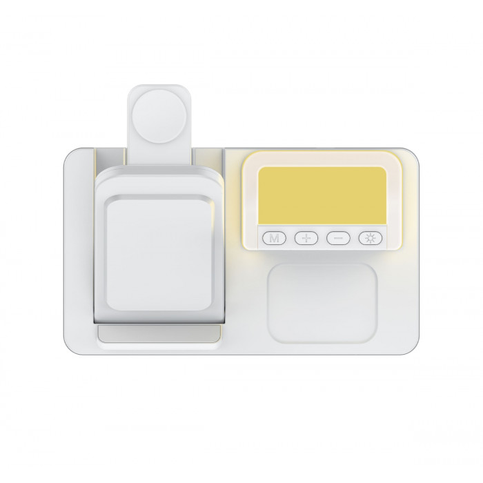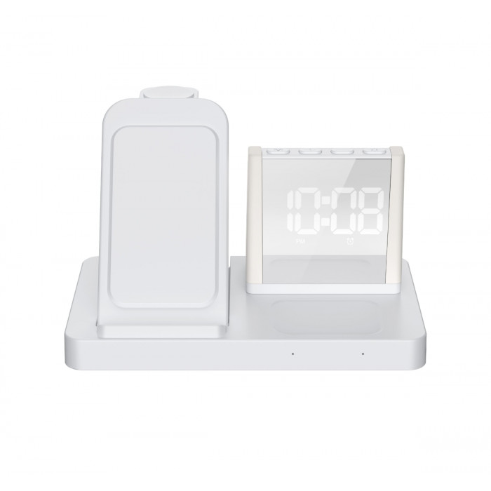 Бездротовий зарядний пристрій з годинником Time Dock. Можна заряджати смартфон, смарт годинник Apple Watch, навушники. Рекомендовано заряджати через блок живлення QC3.0 quick charge. Зручна підставка: оптимально підібраний кут нахилу дозволяє використовувати підставку під час перегляду відео на телефоні. Шнур живлення зарядного пристрою в комплекті. Телефон встановлюється на підставку, навушники TWS — на мат, а смарт годинник — на спеціальну підставку. Зарядний пристрій забезпечує вихідну потужність 15 Вт при розміщенні одного пристрою на підставці, та інтелектуально регулює вихідну потужність від 5 до 10 Вт, залежно від потреб енергоспоживання пристрою. Цифровий будильник, що йде в комплекті, живиться від літієвої батареї. Годинник має LED-екран з можливістю відображення часу у форматах 12 годин та 24 години, 5 рівнів регулювання яскравості та кнопку відкладеного сигналу. Панель годинника також має режим нічного світла і підставку для ручнок на задній стінці годинника. Вхід: DC 5V/3A; 9V/3A; 12V/2A Вихід телефон: 15Вт (max) Вихід навушники: 5Вт (max) Вихід смарт годинник: 2.5Вт (max) Apple Watch Частота: 110 - 205 кГц Ефективність зарядки: 73% Індивідуальна картонна подарункова коробка. Розмір індивідуальної коробки: 18 х 17 х 5,2 см