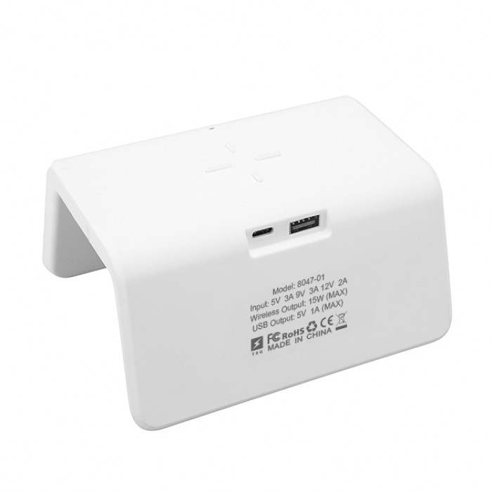 Функціональний годинник з бездротовою зарядкою 15W. Режим часу 12/24 год Подвійний звуковий сигнал будильника для пробудження, функція відкладення. 8-кольоровий світловий нічник-лампа, USB-вихід для зарядки додаткових пристроїв, сенсорне управління,4-рівневий режим яскравості дисплея Аксесуари: кабель USB-A – Type C (1 метр) Інструкція з експлуатації. Розмір виробу 140Х117Х73 мм., вага 210 гр. Нанесення : тамподрук , уф-друк.