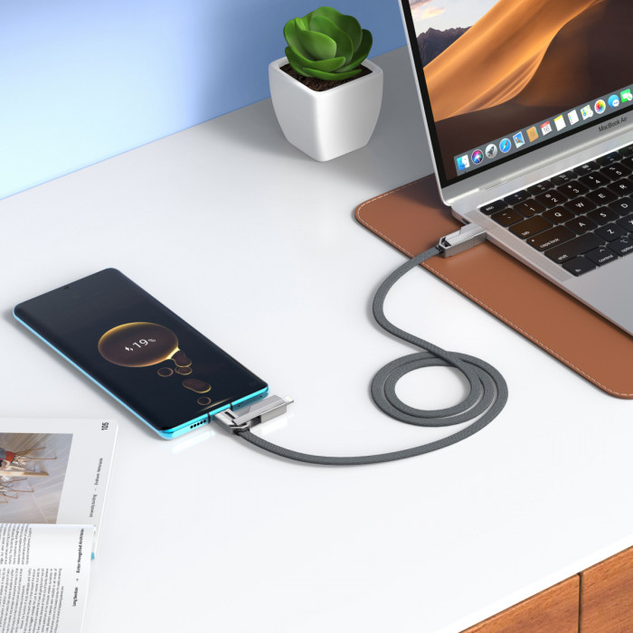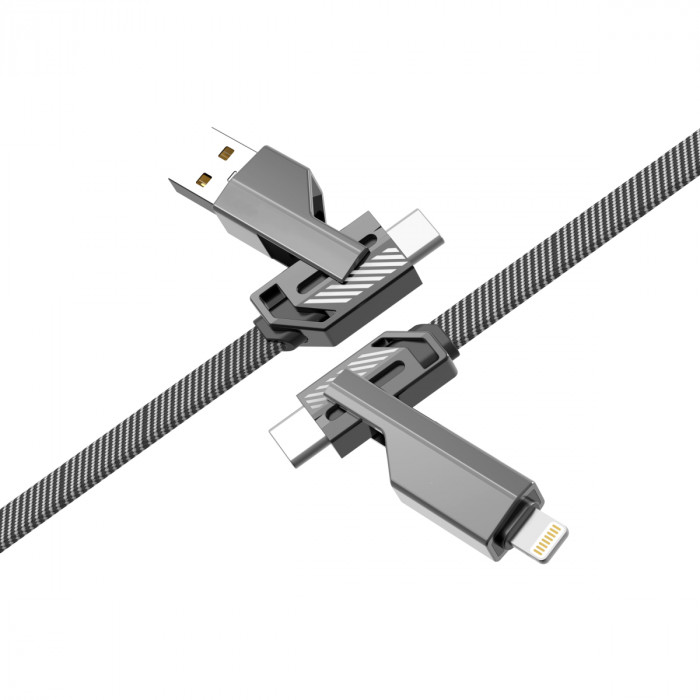 Універсальний кабель 3-в-1 для зарядки гаджетів, довжина в розтягнутому стані 1,2 м. Має стандартний USB вхід для підключення живлення та три різні виходи Lightning+Mscro USB+Type-C. Матеріал: алюміній, нейлоновий плетений шнур 1M, PD 60W, 20V/3A60W, 20V/3A(C-C)30W, 9V/3.4A(C-IP)18W, 5V/3.4A(USB-Type-C)15W, 9V 3.4A(USB-IP) Сумісний з Macbook/IP 15USB+Type-C - Type-C+IPX/12/13/14