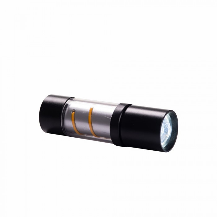 Корпус ліхтарика водонепроникний, виготовлений із міцного алюмінію та пластику, що забезпечує надійний захист від пошкоджень. Ліхтарик оснащений XPE LED лампою, яка забезпечує світловий потік у 65 люменів, достатній для освітлення у темних умовах. На зовніжньому світильнику він має вольфрамову нитку, яка створює м'яке світло для комфортного підсвічення.