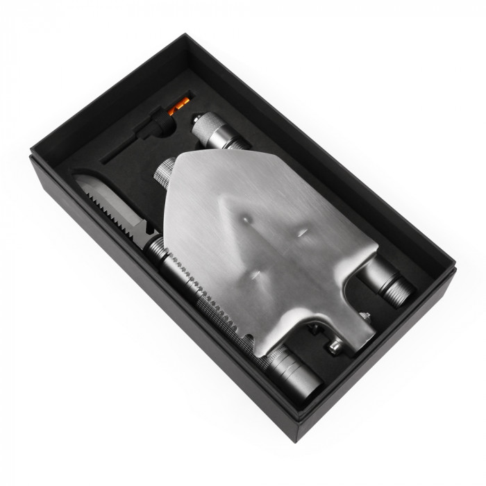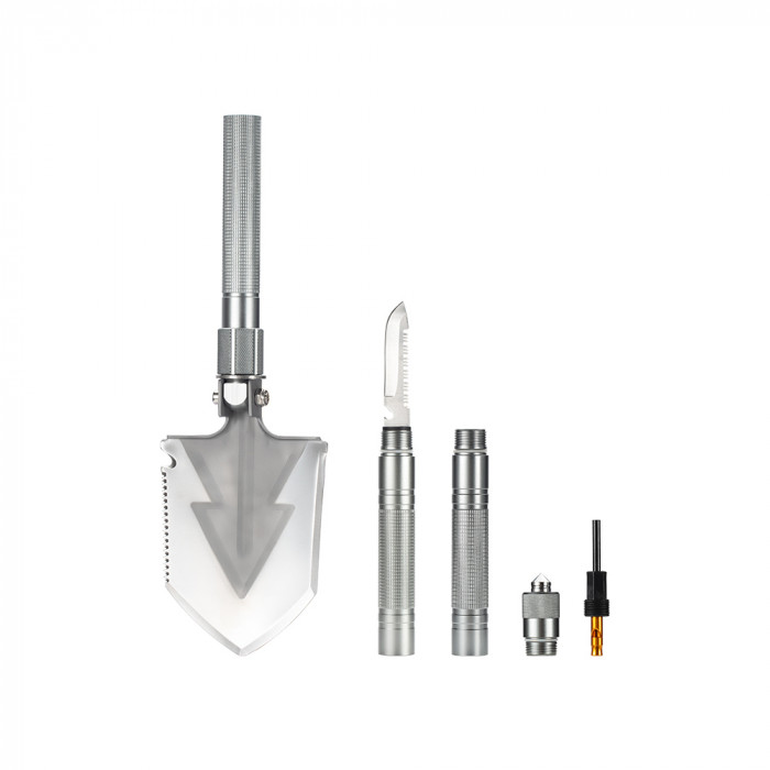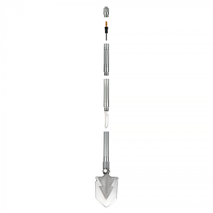 Багатофункціональна лопата для застосування у туризмі. Включає 15 функцій, у тому числі ніж, свисток, викрутка, склобій. Виготовлена з міцних та зносостійких матеріалів, нержавіюча сталь 20cr13 і високоміцний алюміній 6061-T6,зручної конструкції, легко упаковувати, зберігати та переносити. Витримує значні механічні навантаження. Довжина лопати складає 1 метр. Робочу лопать можна зафіксувати під різними кутами, таким чином лопата може виконувати функції: o лопати (при куті нахилу робочої лопаті 180°) o сапки (при куті нахилу робочої лопаті 85°) o гака (при куті нахилу робочої лопаті 30°)