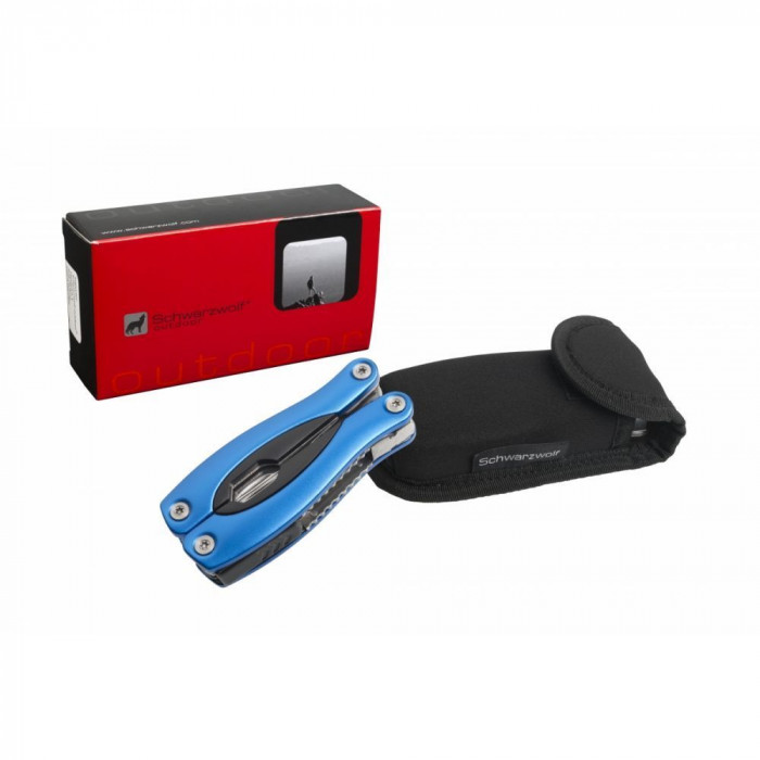 Багатофункціональний інструмент Schwarzwolf 15 в 1 із запобіжним замком у чорному неопреновому чохлі.
