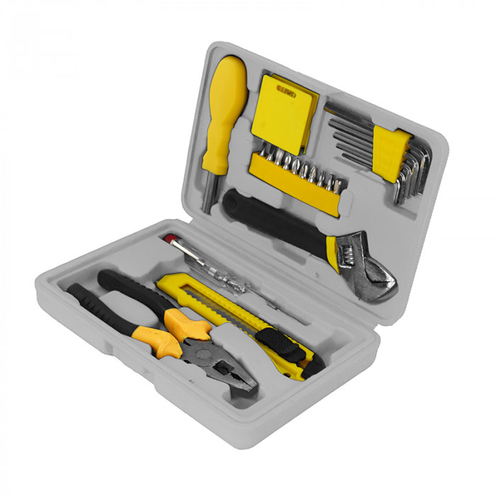 Набір інструментів HOME від Bergamo є самим універсальним домашнім набором. Не дивлячись на компактність в ньому зібрані всі необхідні інструменти, які знадобляться під час дрібних ремонтних робіт і поломок. Кожна деталь виготовлена з високоякісної сталі. Весь набір укомплектований в пластиковий кейс для зручності зберігання, а його поверхня дозволить розмістити ваш логотип розміром 80х30мм. Такий подарунок не розчарує чоловіків. У комплекті: плоскогубці, розвідний ключ, викрутка - тестер, набір викруток біт, рукоятка для викруточних біт, 5 НЕХ ключів, рулетка з рівнем, ніж. Вага: 620 г.