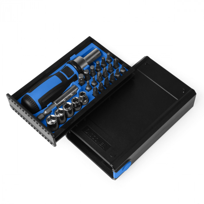 Набір з високоякісної сталі в компактній, пластиковій коробці, яка оригінально відкривається натиском на кнопку. В комплект входить 25 шт інструментів: Викрутка з тресчіткою 1 шт. Магнітний тримач 1 шт. 17 біт (6,35x25 мм): 3 мм, 4 мм, 5 мм, 6 мм, PH1, PH2, PH3, PZ1, PZ2, PZ3, T10, T15, T20, T25, H4, H5, H6 1шт ADP адаптор 5 шт. 1/4" головки: 5 мм, 6 мм, 7 мм, 8 мм, 9 мм.Розмір набору 145Х85Х35 мм. Нанесення тамподрук, уф-друк, об'ємна смоляна наліпка.