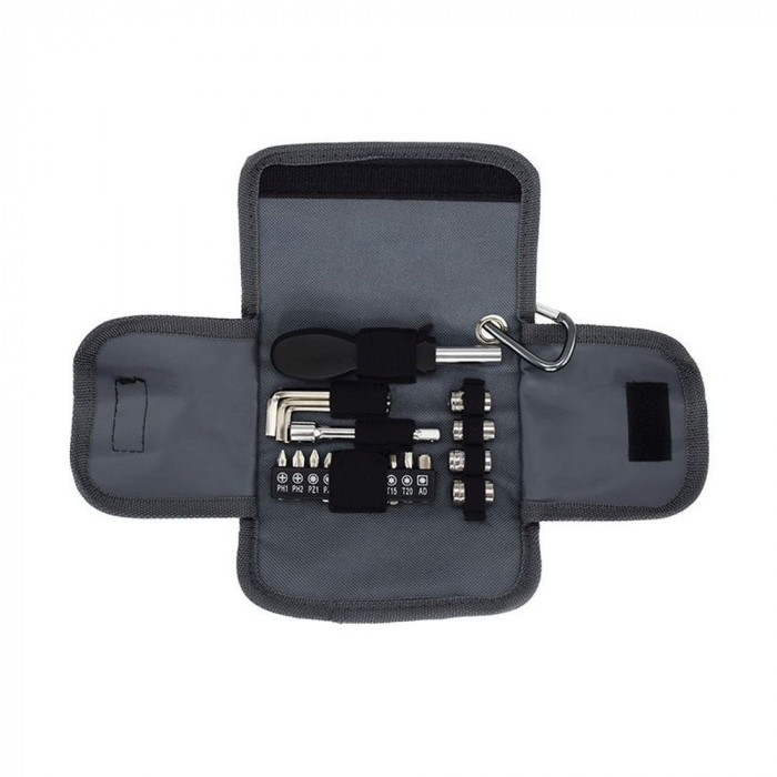 Набор инструментов 19 в 1 HELPER от Bergamo с самым необходимым количеством инструментов всегда будет уместен в любом доме или машине. В нём содержится всё необходимое для того, чтобы раскрутить, закрутить и для других видов монтажных работ. Удобная и практичная вещь для каждого мужчины и отличный подарок. Компактные размеры позволяют хранить набор прямо в бардачке автомобиля, а с помощью карабина можно подвесить за пояс. Компактный и недорогой, вот так лаконично и просто можно описать этого помощника. В комплекте идут такие инструменты: держатель для отверточных бит, удлинитель для держателя бит, набор бит (10 шт), 3 НЕХ ключи (3-5 мм), 4 торцевые головки (7-10 мм). Упакован в раскладывающемся чехле, на котором предлагаем нанести рекламный логотип. Изготовлен из стали с элементами пластика. Размер набора: 150х90х25 мм. Вес: 265 г.