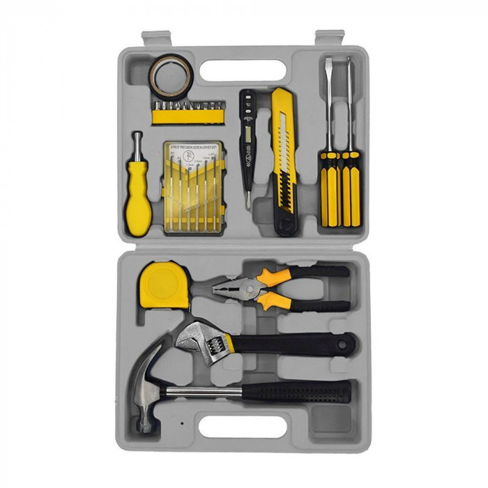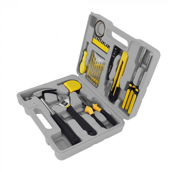 Набор инструментов MASTER от Bergamo собрал 26 универсальных инструментов в одном кейсе. В нём продумана каждая деталь, есть всё для того, чтобы закрутить, отрезать, отмерить, закрутить или забить. Каждому мужчине необходимы качественные инструменты, которые помогут ему решить непредвиденно возникшие или запланированные ремонтные работы. Этот набор идеален для домашних мастеров. В комплекте: молоток, плоскогубцы, разводной ключ, несколько видов отверток, набор отверточных бит, рукоятка для отверточных бит, рулетка на 2м, нож, электроизоляционная лент. Размер изделия: 270х215х65 мм. Вес: 1390 г.