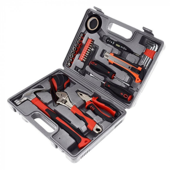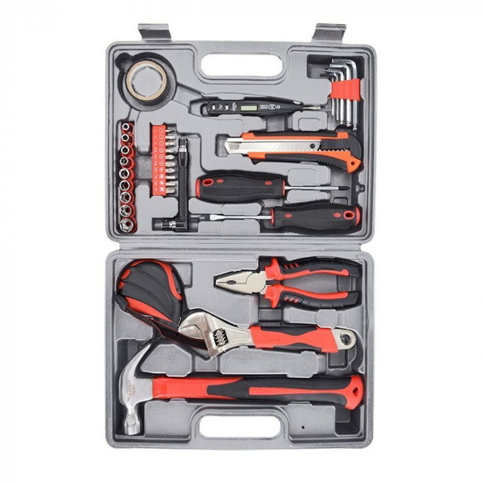 Универсальный набор инструментов MASTER PRO от Bergamo - это самый функциональный набор, который собрал коллекцию из 34 необходимых инструментов в 1. Идеально подходит для решения всех основных бытовых задач и домашних ремонтных работ. Специальный кейс изготовленный из прочного пластика позволит хранить инструменты бережно и компактно, а прорезиненные ручки помогут надежно держать в руках инструменты без соскальзывания. Этот набор изготовлен из стали и стекловолокна. Укомплектован такими инструментами как: молоток, разводной ключ, плоскогубцы, отвертки, набор отверточных бит, рукоятка для бит, 5 НЕХ ключи, 9 торцевых головок, рулетка на 3м, нож, электроизоляционная лента, а практически каждый инструмент изготовлен из высококачественной стали. Размер: 300х230х81 мм. Вес: 2140 г.