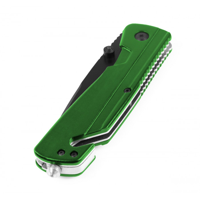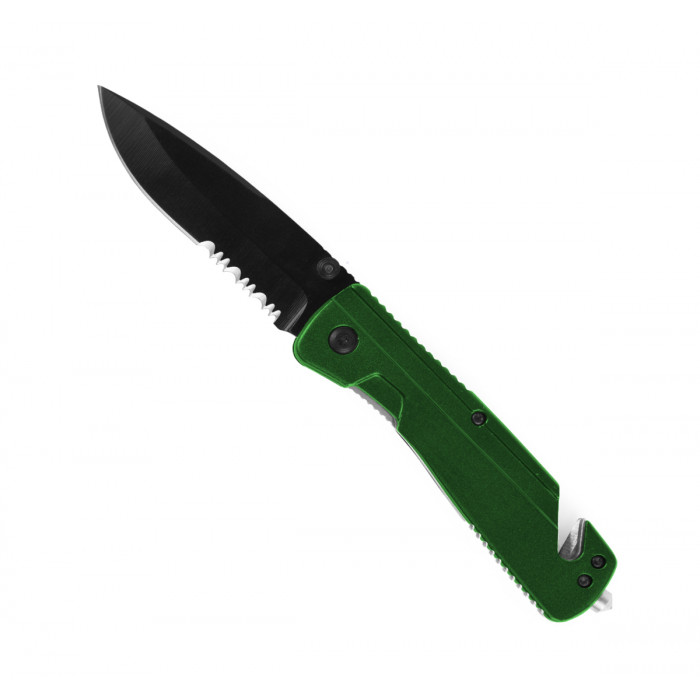 Ніж з високоякісної нержавіючої сталі, гстрим лезом з фіксатором, кліпсою для чіпляння на ремінь. Має такі додаткові безпекові функції: - Стержень для вибивання і розбивання скла в автомобілі у випадку аварії якщо закриті або заблоковані двері. Ця функція може врятувати вам життя. - Подвійне приховане лезо для легкого обрізання реміня безпеки якщо заклинило реміневий механізм. Упаковка елегантна чорна коробка. Розмір в складеному стані 11,5 см., у відкритому 20,1 см.