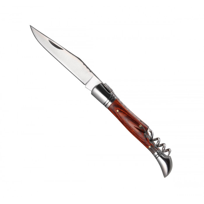 Ніж з високоякісної нержавіючої сталі, гострим лезом, має штопор. Тримач з дерев'яними вставками. Розмір леза 10 см, розмір в закритому стані 11,8Х2,5Х1,7 см.