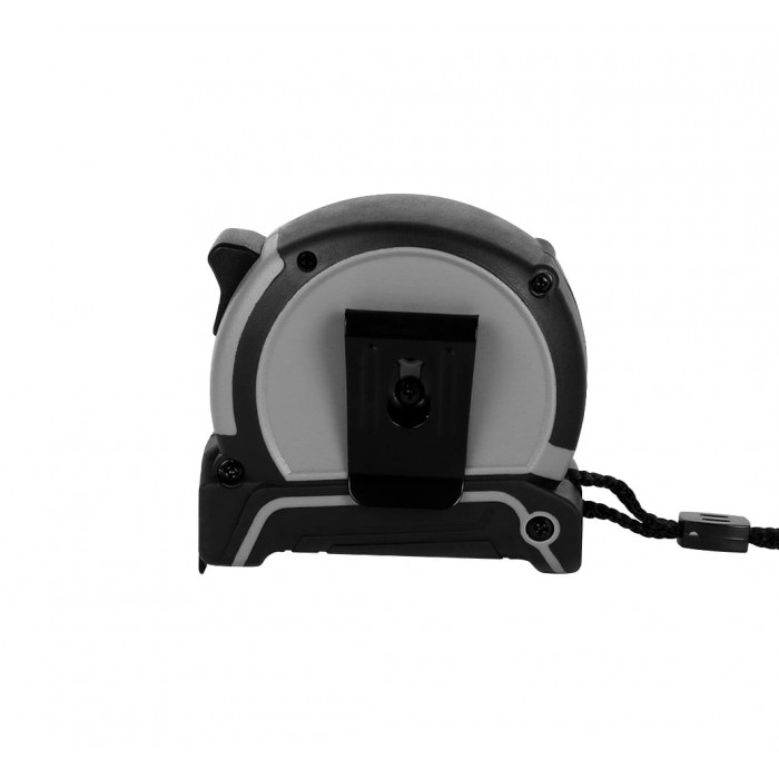 Рулетка будівельна 5 метрів. Стійкий прорезинений корпус, металева стрічка. Ширина полотна мірної стрічки 25 мм. Модель з фіксатором, кліпса тримач для ременя, шнурок для зручного тримання. Розмір індивідуальної коробки: 8 х 7 х 5 см.