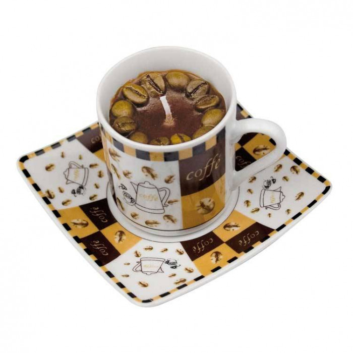 Оригинальная свеча тёмного цвета с запахом кофе. Имеет декоративную, цветную подставку в форме кофейной чашки с блюдцем. Предназначена исключительно для любителей кофейных напитков. Упакована в целофановом мешочке.