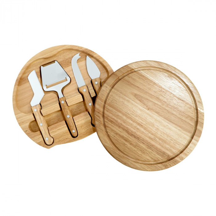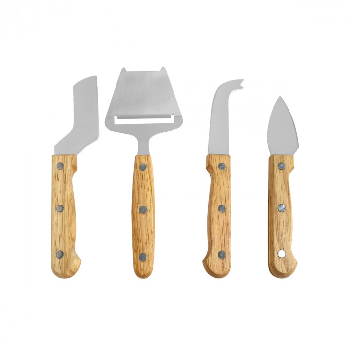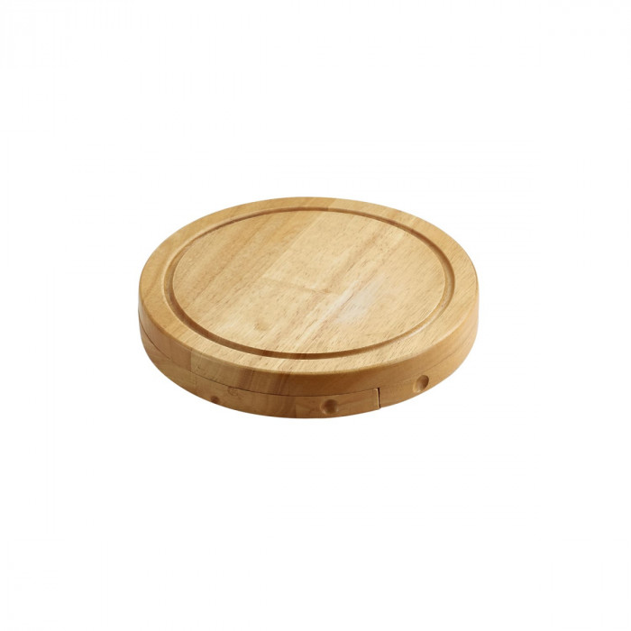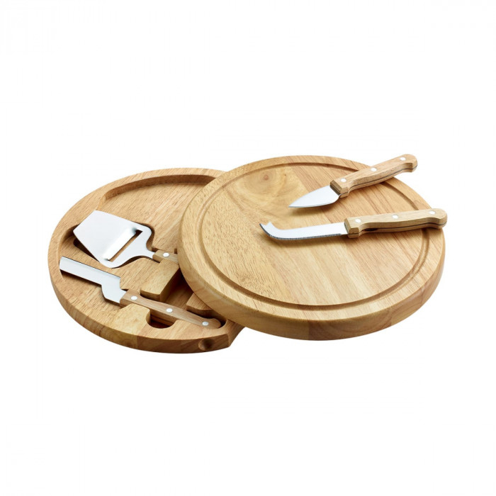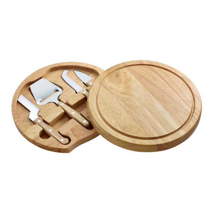 Матеріал: нержавіюча сталь, дерево Розмір: d26 x 3,8 см 1 ніж для м’якого сиру: 18,5 см 1 слайсер для сиру: 19,2 см 1 зубчастий ніж: 18,5 см 1ніж для твердого сиру: 16,5 см
