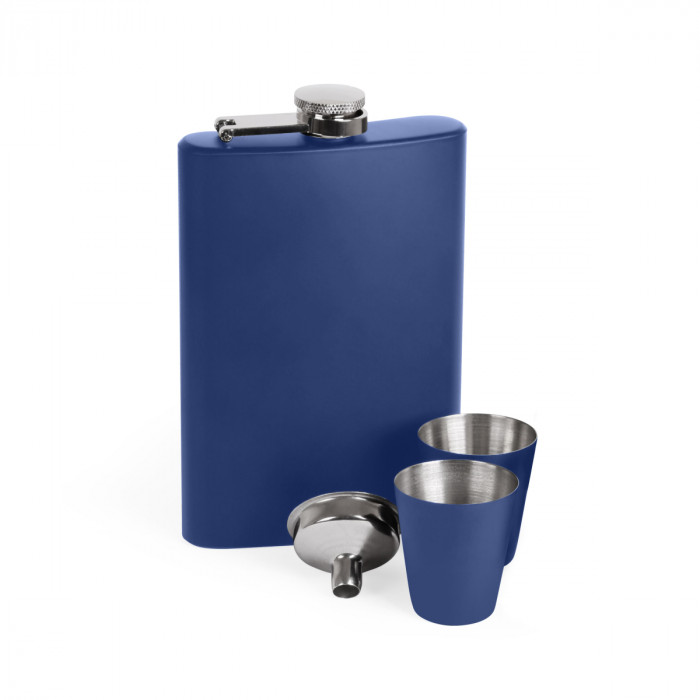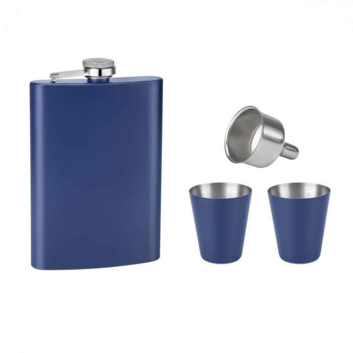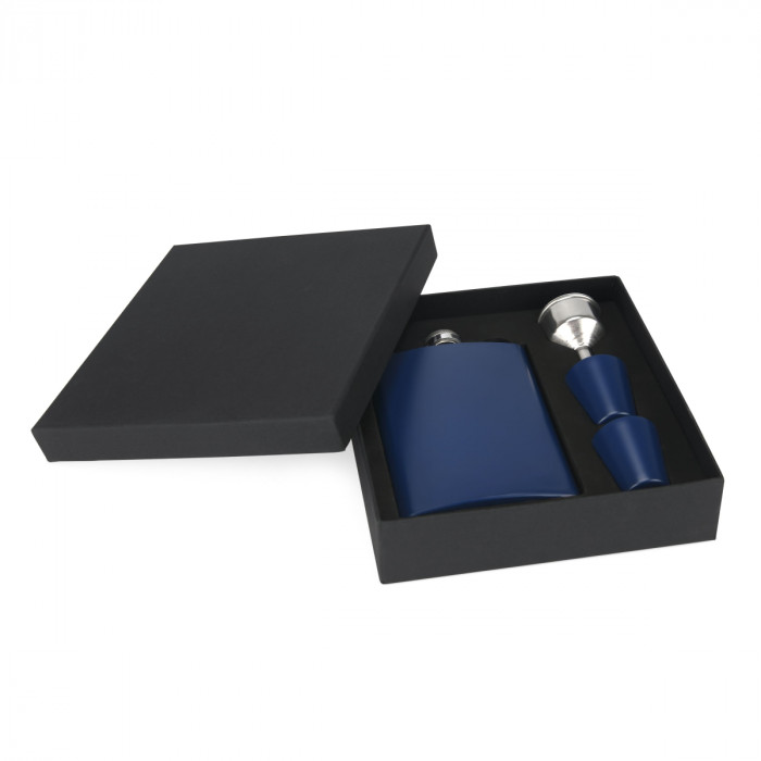 Набір фляга та 2 чарки синього матового кольору з лійкою в чорній подарунковій коробці з нержавіючої сталі, з одинарною стінкою