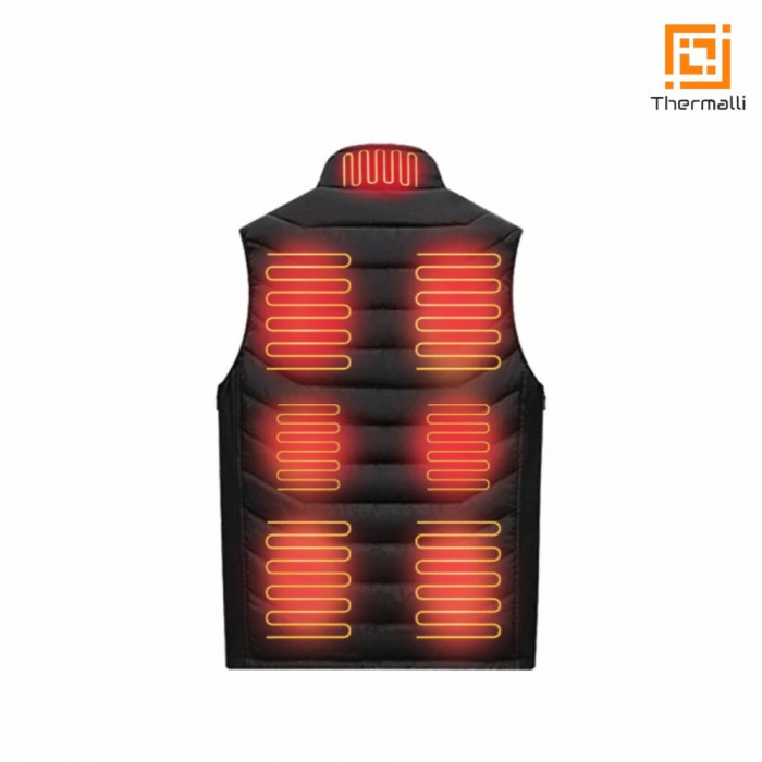 Жилет досить потужно генерує тепло, виріб має 11 зон нагріву. Спереду на рівні живота вмонтовані 2 зони обігріву, 2 зони – на плечах, 1 – на комірі. Найбільше нагрівальних елементів на спині, тут 6 зон обігріву, які розміщені симетрично 3 х 3.