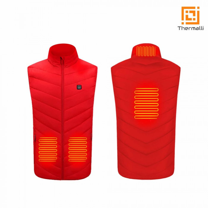 Нагрівачі знаходяться під підкладкою, шнур для під’єднання павербанка виведений у кишеню. (Показники напруги: 7,4 та 12 В). Кнопка вмикання – зліва на рівні грудей. Для вмикання обігріву потрібно натиснути й утримувати кнопку протягом 3 секунд, потім необхідно налаштувати бажаний режим.