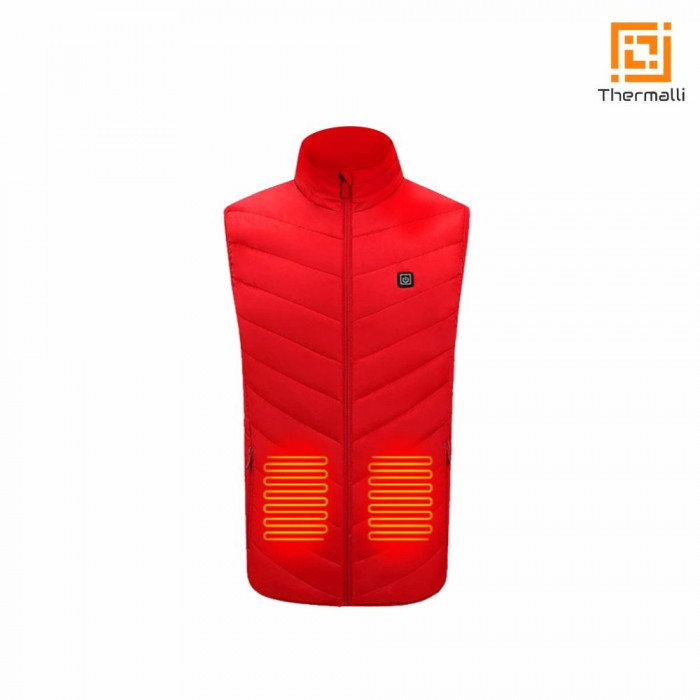 Нагрівачі знаходяться під підкладкою, шнур для під’єднання павербанка виведений у кишеню. (Показники напруги: 7,4 та 12 В). Кнопка вмикання – зліва на рівні грудей. Для вмикання обігріву потрібно натиснути й утримувати кнопку протягом 3 секунд, потім необхідно налаштувати бажаний режим.