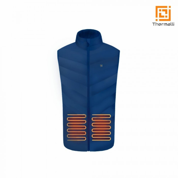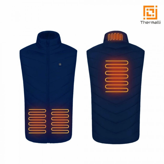 Нагрівачі знаходяться під підкладкою, шнур для під’єднання павербанка виведений у кишеню. (Показники напруги: 7,4 та 12 В). Кнопка вмикання – зліва на рівні грудей. Для вмикання обігріву потрібно натиснути й утримувати кнопку протягом 3 секунд, потім необхідно налаштувати бажаний режим.