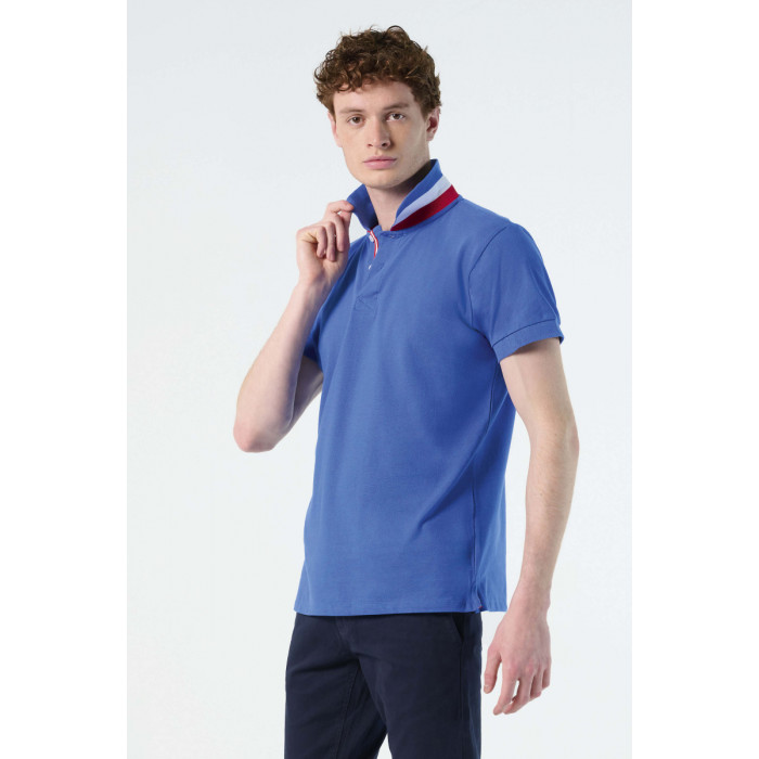 Мужская рубашка поло с коротким рукавом;100% хлопок;воротник и нижние края рукавов в резинку;укрепляющая тесьма по вороту.; Двуцветная контрастная обратная сторона воротника.Усиленная планка с 2 белыми перламутровыми пуговицами.Тонкая контрастная полоска