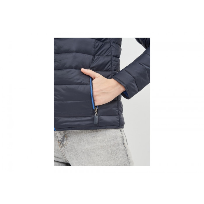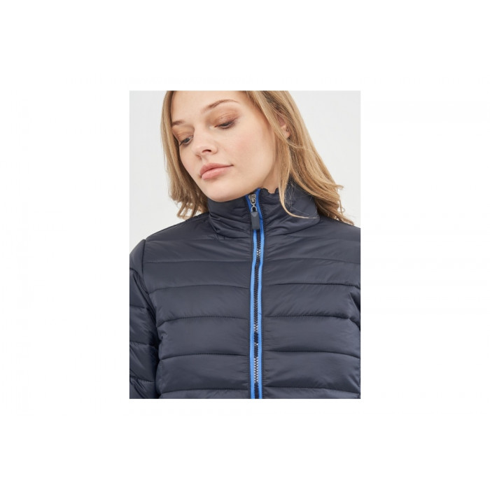 Стильна жіноча куртка з глянцевого поліестеру; запезпечує чудові теплоізоляційні властивості, маючи абсолютно незначну вагу; 2 бокові кишені з контрасною застібкою-блискавкою; контрасна блискавка; матеріа верху та підклатки - 100 % поліестер. Прати в пральній машинці за низького температурного режиму (30 градусів) та в щадних режимах прання.