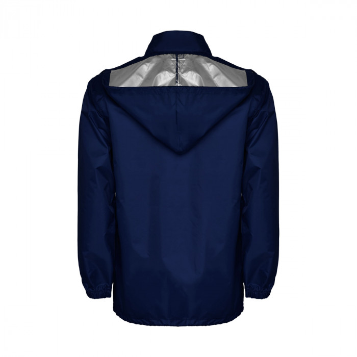 Водонепроникний плащ з високою горловина і складним капюшон. Міцний матеріал з полімерних волокон із захисним просоченням, який не вбирає вологу. Має регулювальний шнурок. Передня блискавка з відповідним знімачем. Дві бічні кишені з клапанами. Еластичні манжети. Еластичний ремінь всередині кишені для складання та зберігання. Матеріал: 100% водонепроникний поліестер, сріблясте покриття, 70 г/кв.м.