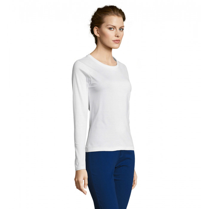 Футболка женская с круглым воротом и длинным рукавом SOL’S MAJESTIC. Стиль: классический, глубокий вырез -приталенная модель, манжеты без резинки; изделие выкроено из трикотажного полотна. Материал: ДЖЕРСИ 150. Полугребенной 100% хлопок, укрепляющая тесьма по вороту, край круглого ворота связан резинкой с эластаном. Вариант для мужчин: MONARCH-11420